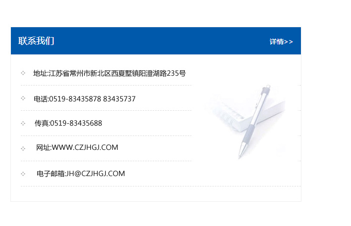地址:常州市新北區友邦商務大廈1幢16、17層  電話:0519-85101652  傳真:0519-85112595  郵編:213022  網址:www.cz-jiayue_cn.yyhwzp.com  郵箱:xiajifengaa@163.com
